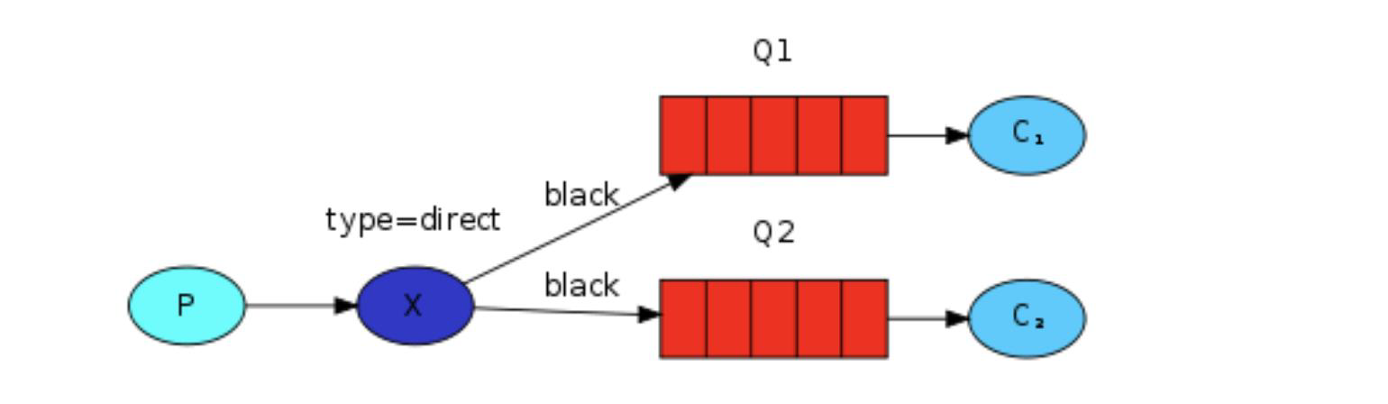 在这种绑定情况下,生产者发布消息到 Exchange 上,绑定键为 Orange 的消息会被发布到队列 Q1。绑定键为 Black,Green 和的消息会被发布到队列 Q2,其他消息类型的消息将被丢弃。