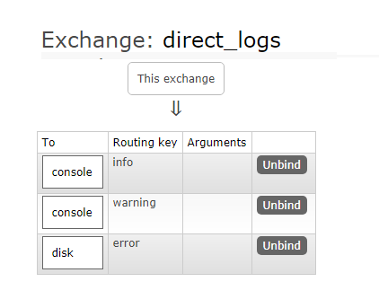 private static final String EXCHANGE_NAME = "direct_logs"; public static void main(String[] argv) throws Exception { Channel channel = RabbitUtils.getChannel(); channel.exchangeDeclare(EXCHANGE_NAME, BuiltinExchangeType.DIRECT); String queueName = "console"; channel.queueDeclare(queueName, false, false, false, null); channel.queueBind(queueName, EXCHANGE_NAME, "info"); channel.queueBind(queueName, EXCHANGE_NAME, "warning"); System.out.println("等待接收消息....."); DeliverCallback deliverCallback = (consumerTag, delivery) -> { String message = new String(delivery.getBody(), "UTF-8"); System.out.println("接收绑定键:"+delivery.getEnvelope().getRoutingKey()+",消息:"+message); }; channel.basicConsume(queueName, true, deliverCallback, consumerTag -> { }); } }