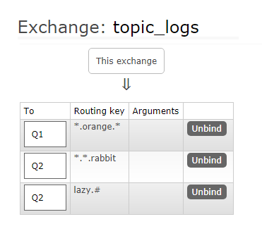private static final String EXCHANGE_NAME = "topic_logs"; public static void main(String[] argv) throws Exception { Channel channel = RabbitUtils.getChannel(); channel.exchangeDeclare(EXCHANGE_NAME, "topic"); String queueName="Q2"; channel.queueDeclare(queueName, false, false, false, null); channel.queueBind(queueName, EXCHANGE_NAME, "*.*.rabbit"); channel.queueBind(queueName, EXCHANGE_NAME, "lazy.#"); System.out.println("等待接收消息....."); DeliverCallback deliverCallback = (consumerTag, delivery) -> { String message = new String(delivery.getBody(), "UTF-8"); System.out.println("接收队列:"+queueName+"绑定键:"+delivery.getEnvelope().getRoutingKey()+",消息:"+message); }; channel.basicConsume(queueName, true, deliverCallback, consumerTag -> { }); } }