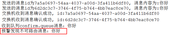 消息消费者 1 2 3 4 5 6 7 8 9 10 11 @Component @Slf4j public class ConfirmConsumer { public static final String CONFIRM_QUEUE_NAME = "confirm.queue" ; @RabbitListener(queues =CONFIRM_QUEUE_NAME) public void receiveMsg (Message message) { String msg=new String(message.getBody()); log.info("接受到队列confirm.queue消息:{}" ,msg); } }